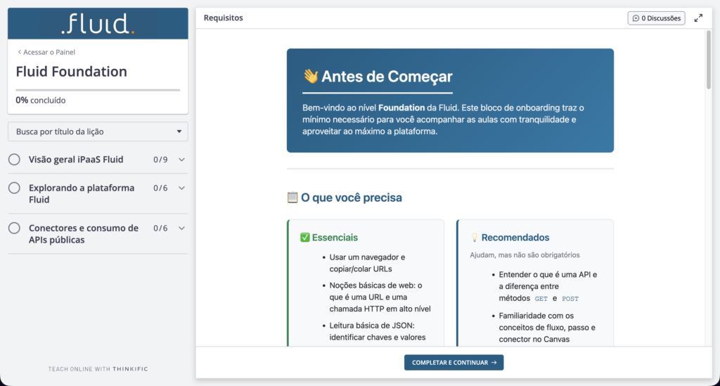 O Fluid Academy foi estruturado como uma trilha progressiva que acompanha a evolução profissional em integrações.